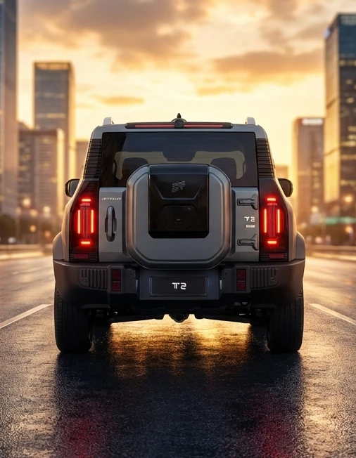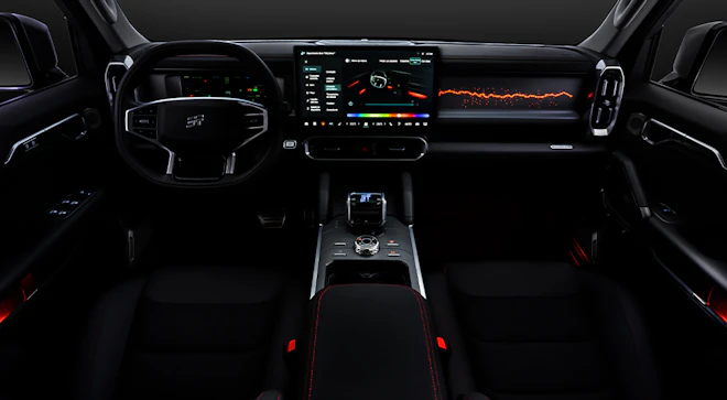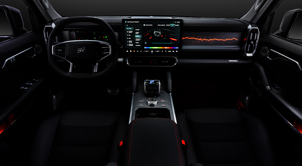 O interior do Jetour T2 une sofisticação e controle absoluto. Destaca-se pela ampla tela multimídia, console robusto com seletor ergonômico e a exclusiva iluminação ambiente personalizável, que transforma a atmosfera da cabine e eleva sua experiência ao volante.