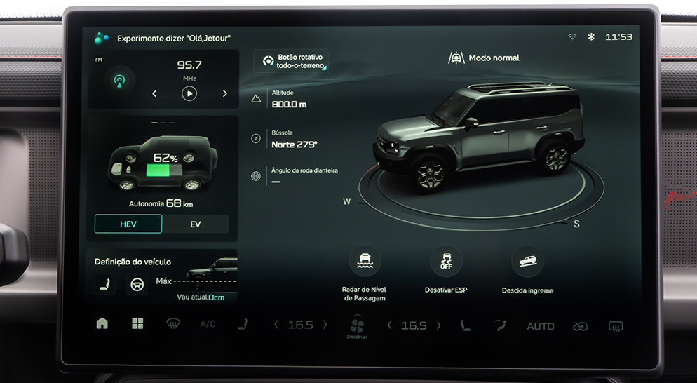 R$299.900,00A super tela multimídia concentra todas as funções do SUV em uma interface rápida e intuitiva. Monitore o consumo do sistema híbrido e acesse dados essenciais para o off-road, como bússola e altitude, com apenas um toque.
