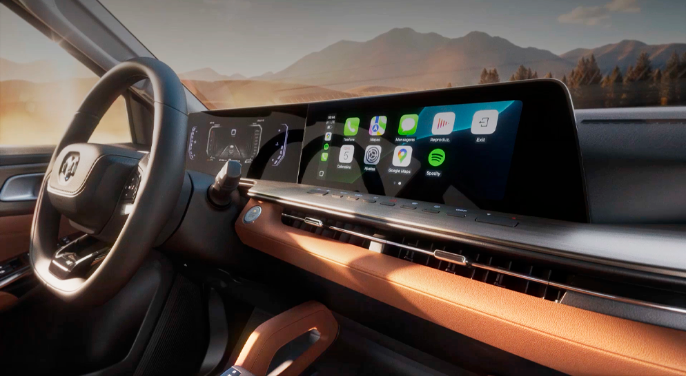 Interior Ram Dakota ainda mais moderno. Com 12, 3”, a Central Multimídia conta com Android Auto e Apple CarPlay sem fio, navegação embarcada, assistente digital e páginas off‑road; já o quadro de instrumentos, de 7”, permite o monitoramento das informações da picape, com leitura fácil e direta.