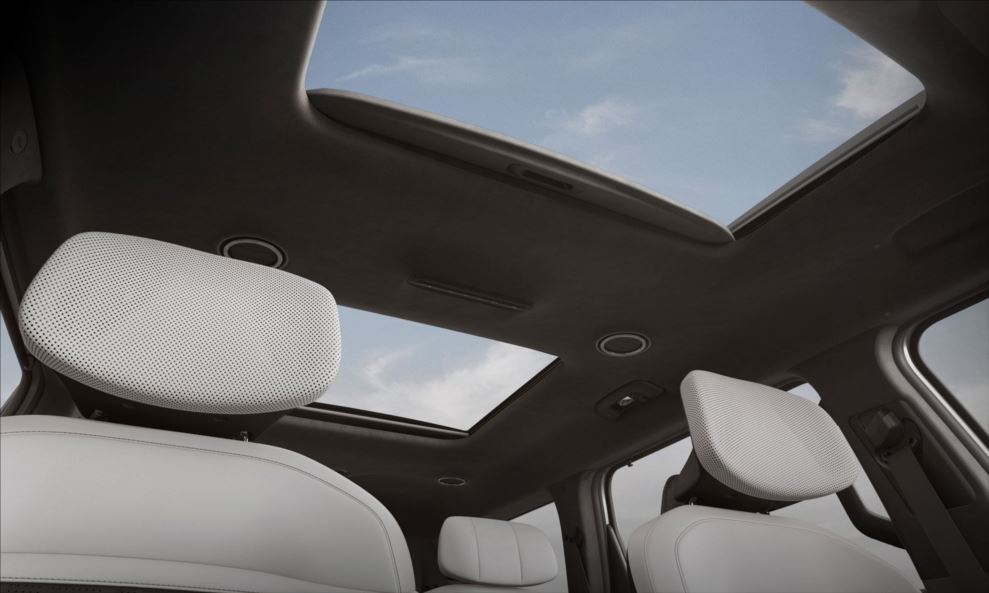 O Kia EV9 oferece teto solar duplo panorâmico, com acionamento elétrico, proporcionando uma experiência relaxante a todos os ocupantes do veículo.