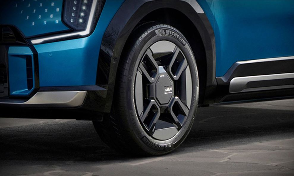 As rodas de liga leve aro 21" com acabamento em black piano e prata escurecido complementam o design ousado do Kia EV9.
