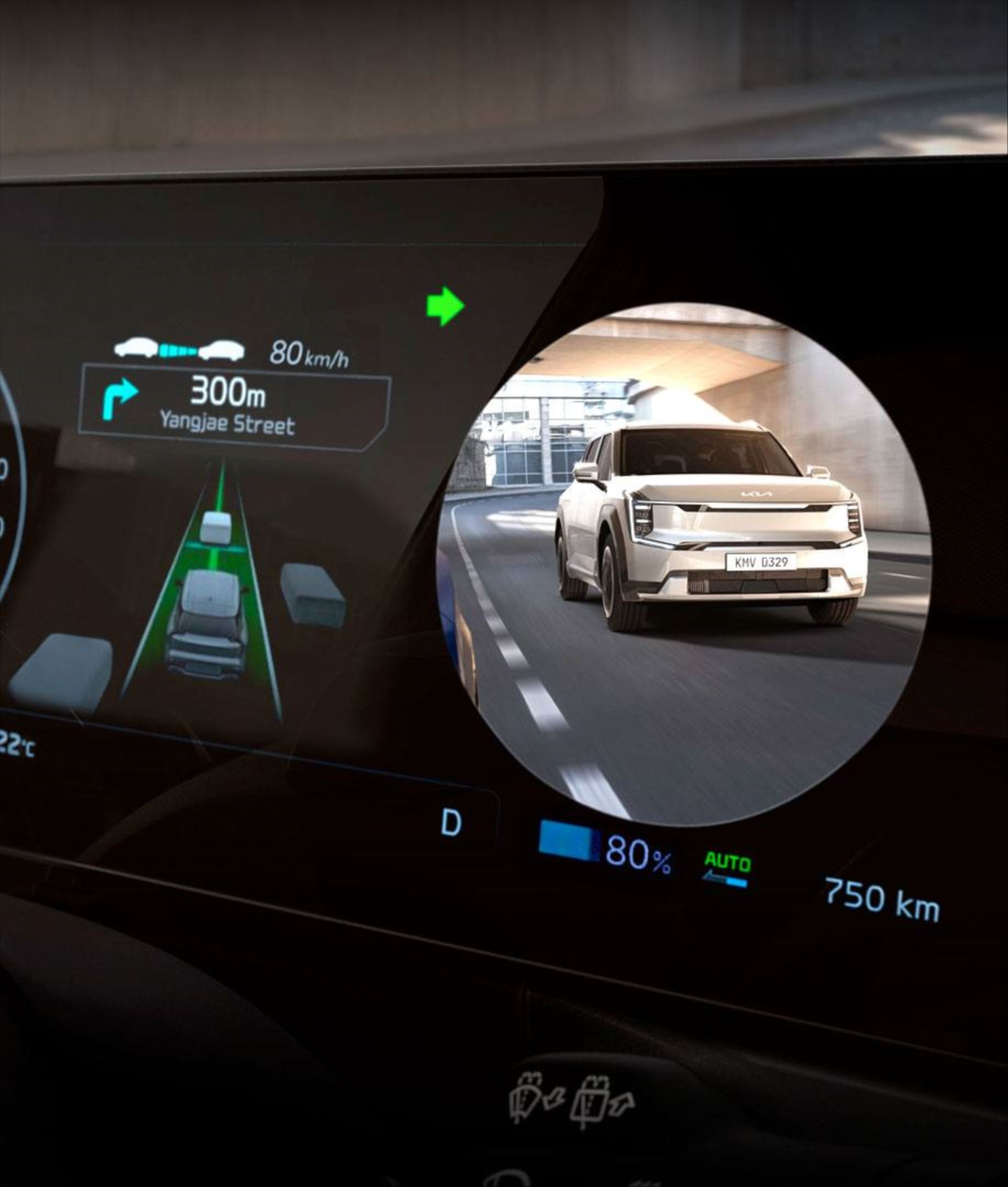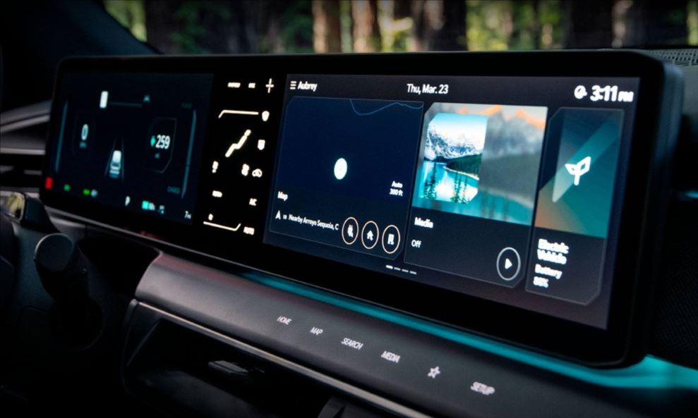 O Kia EV9 conta com um display digital panorâmico de 29,9”, com telas integradas do painel digital de instrumentos de 12,3”, do cluster central de 5,3” e do multimídia de 12,3”, com comandos sensíveis ao toque. Além disso, os botões touch ocultos no painel complementam a experiência digital no veículo ao permitir que os botões físicos sejam reduzidos, oferecendo um design clean.