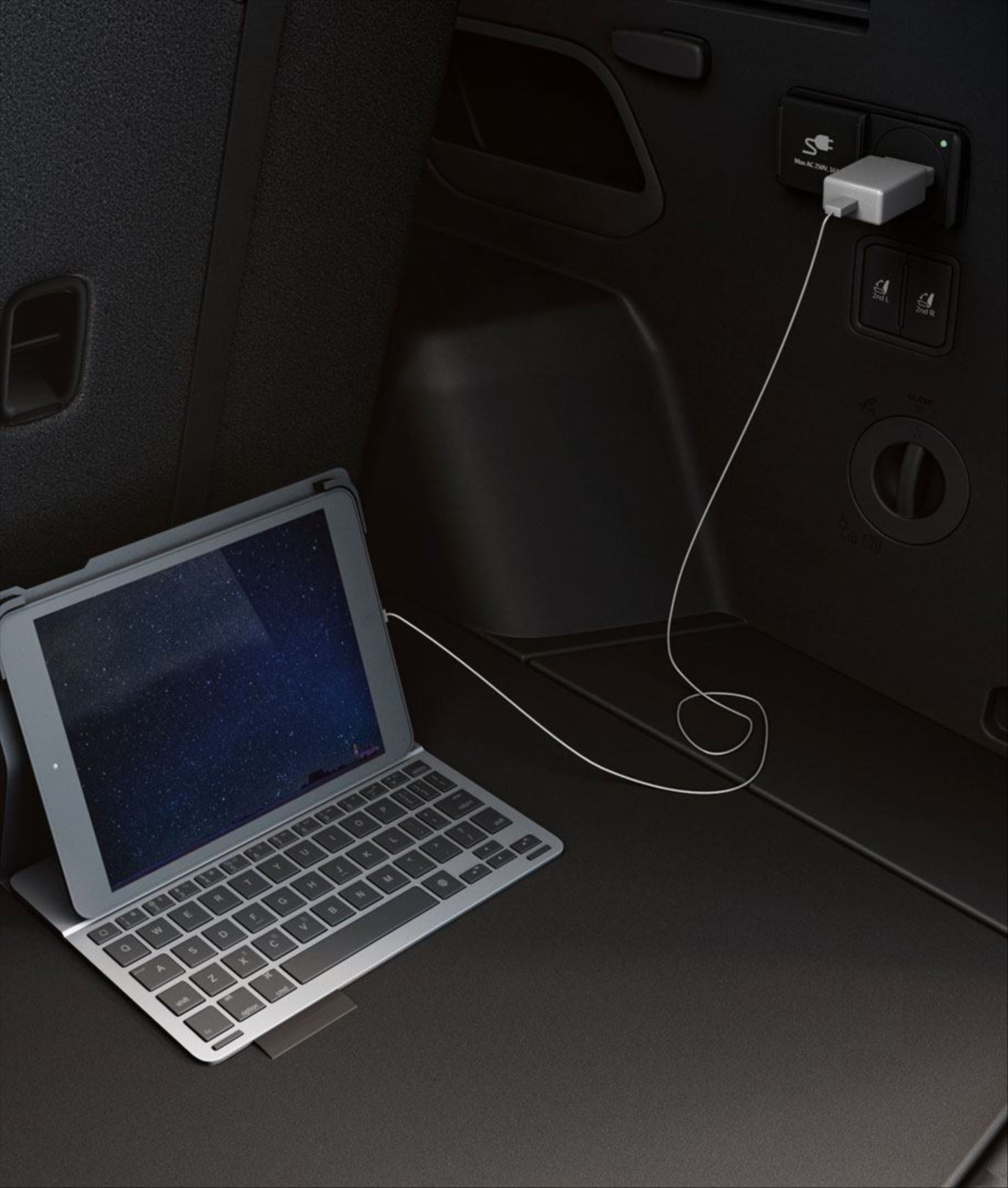 Para oferecer praticidade e conforto nas atividades do dia a dia, o Kia EV9 possui uma tomada auxiliar de energia 12V no porta-malas e outra no console inferior dianteiro para carregamento de equipamentos eletrônicos.